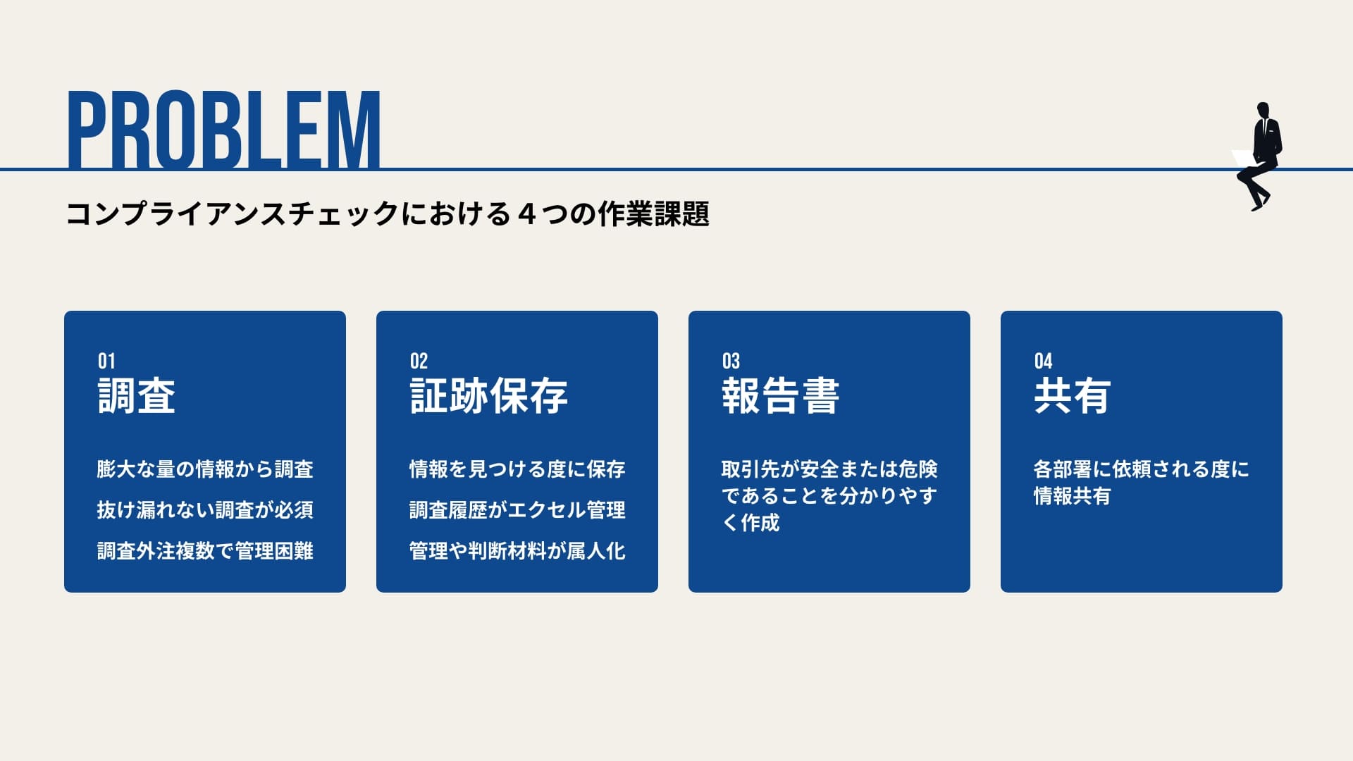 - コンプライアンスチェックを実施したことがなく、そもそも何をどのようにしたら良いのかわからない。