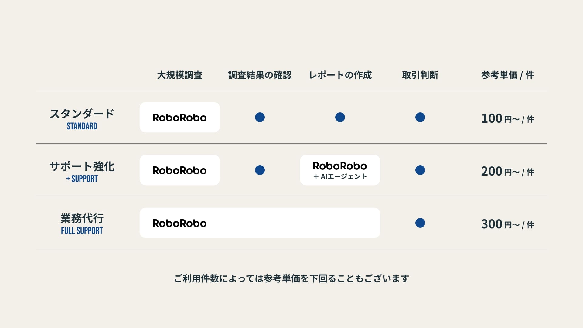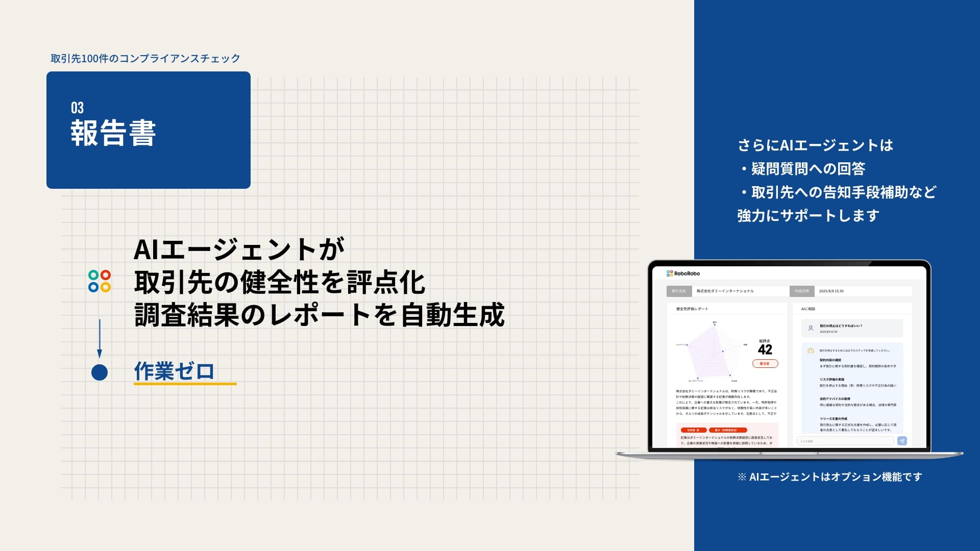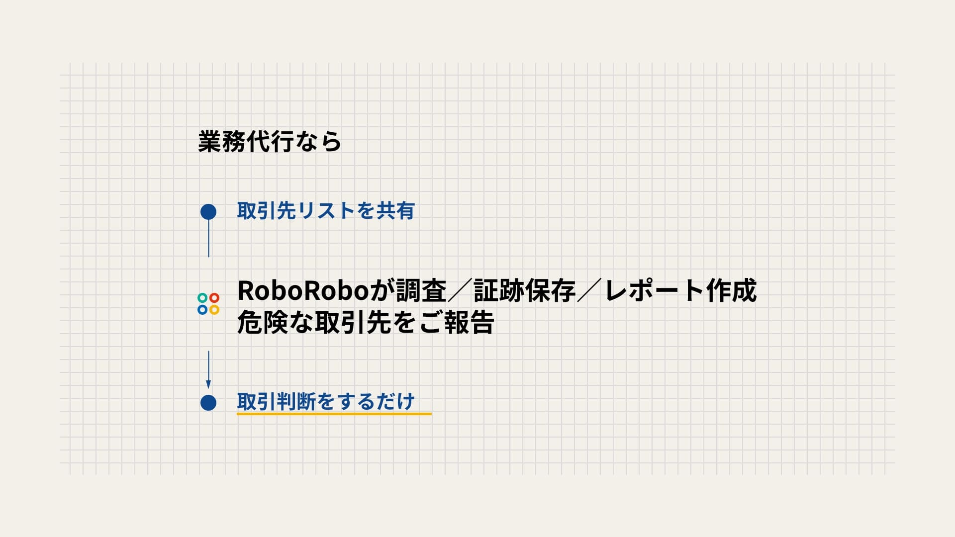 - 「RoboRoboコンプライアンスチェック」は、Googleを活用した検索行為と検索結果のデータとりまとめを自動化するサービスです。検索結果でアラートの上がった対象企業や個人に関するより詳細の情報が必要な際は、オプションサービスとして提供可能です。
