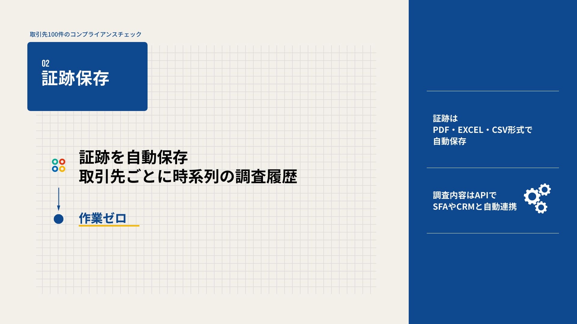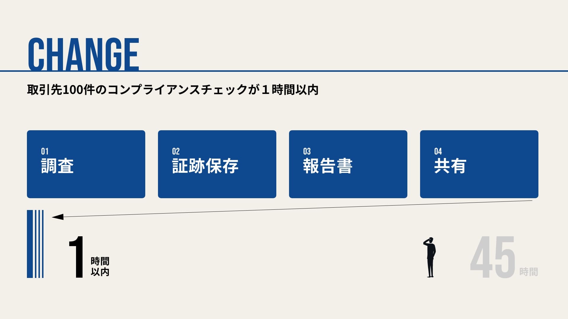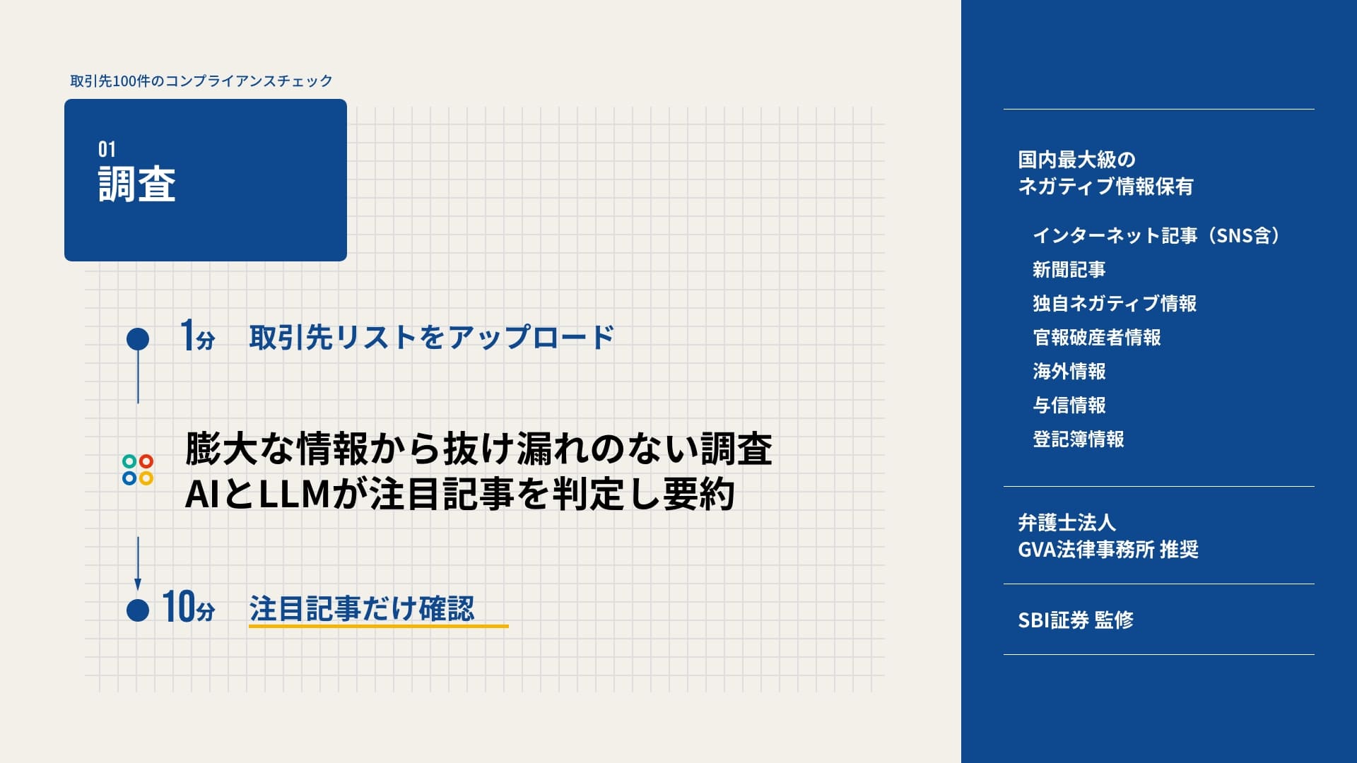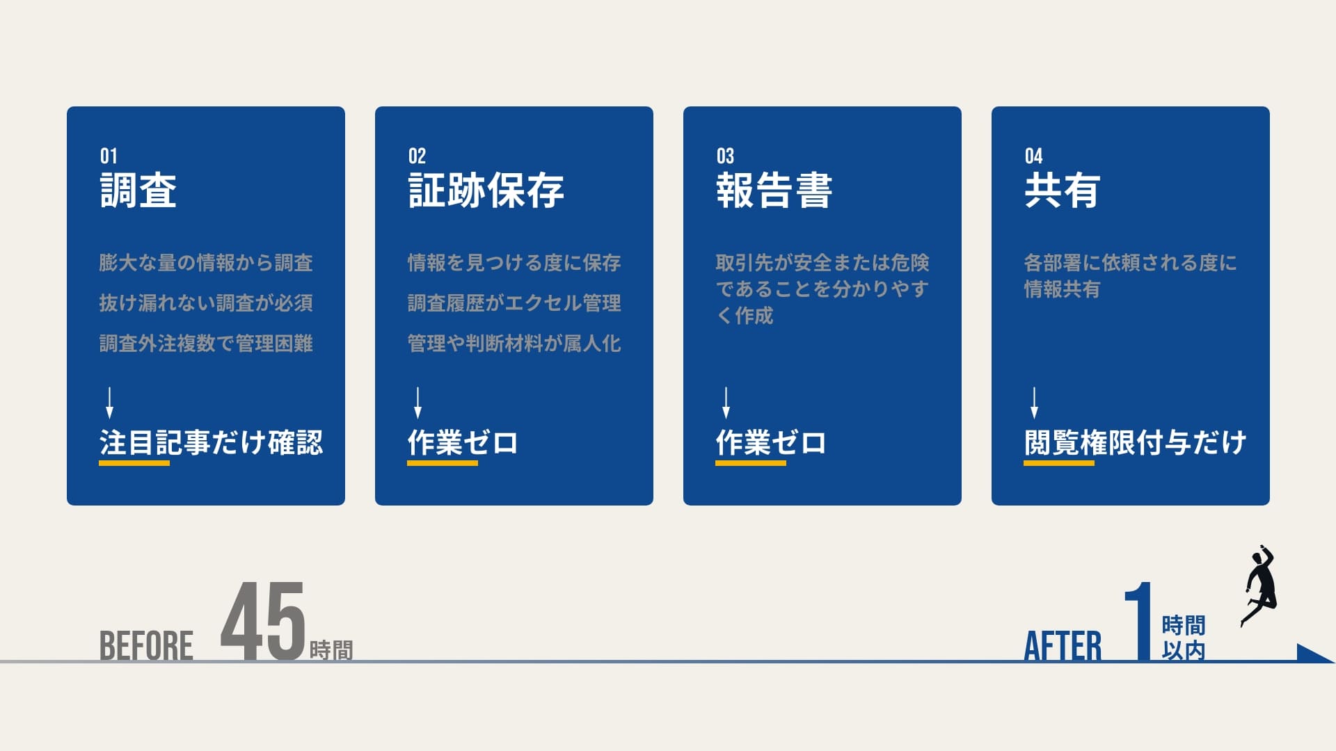 - 「RoboRoboコンプライアンスチェック」は、Googleを活用した検索行為と検索結果のデータとりまとめを自動化するサービスです。検索結果でアラートの上がった対象企業や個人に関するより詳細の情報が必要な際は、オプションサービスとして提供可能です。